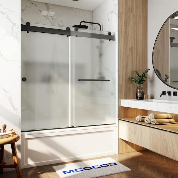 56-60.75 in. W x 66 in. H Double Sliding Frameless Soft Close Tub Door in Matte Black with 3/8 in. Frosted Glass