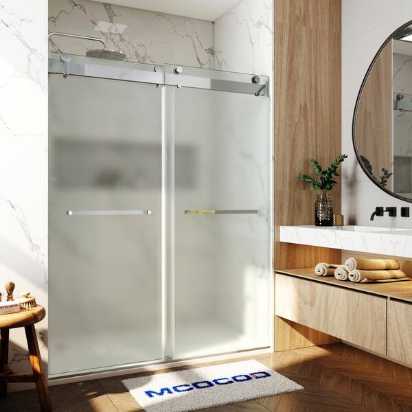 56-60.75 in. W x 79 in. H Double Sliding Frameless Soft Close Shower Door in Chrome with 3/8 in. Frosted Glass