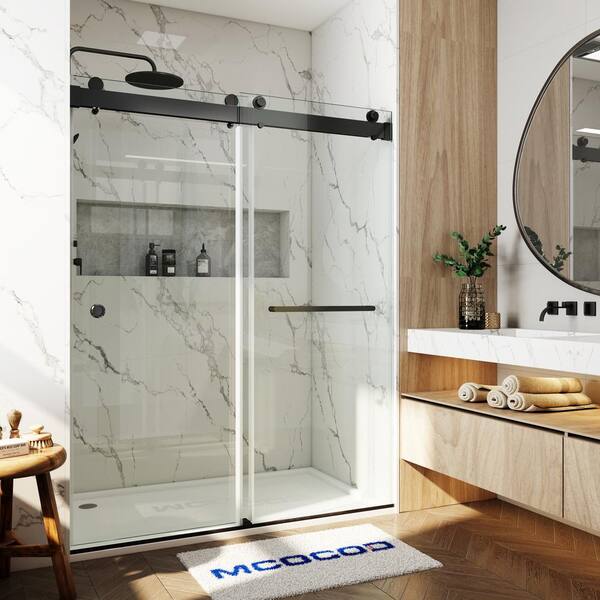 61-66.75 in. W x 76 in. H Double Sliding Frameless Soft Close Shower Door in Matte Black with 3/8 in. Clear Glass