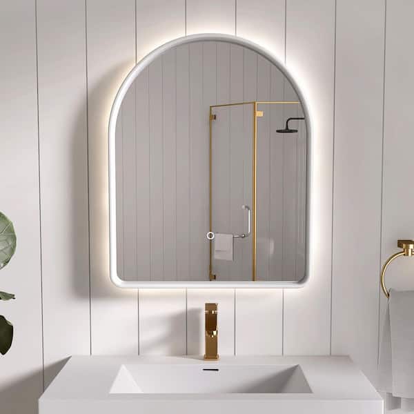 24 in. W x 30 in. H Arched Solid Surface Framed Wall Mount Bathroom Vanity Mirror in Matte White