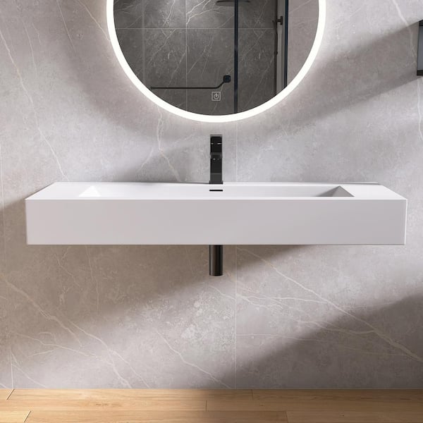 48 in. x 18 in. x 6 in. Solid Surface Wall-Mounted Bathroom Vessel Sink in White with Faucet Hole and Overflow