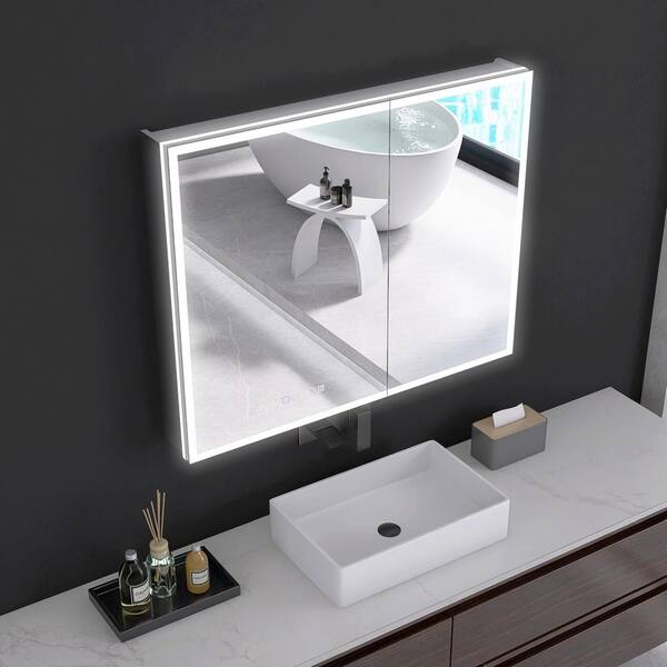 HHG 40 in. W x 32 in. H Rectangular Silver Aluminum Recessed/Surface Mount Medicine Cabinet with Mirror and LED