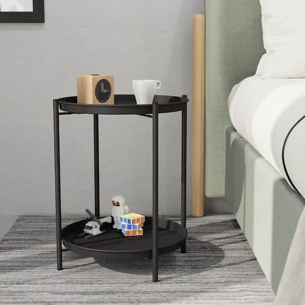 18 in. Outdoor Side Table, Steel 2-Tier End Table Round Accent Table, Black