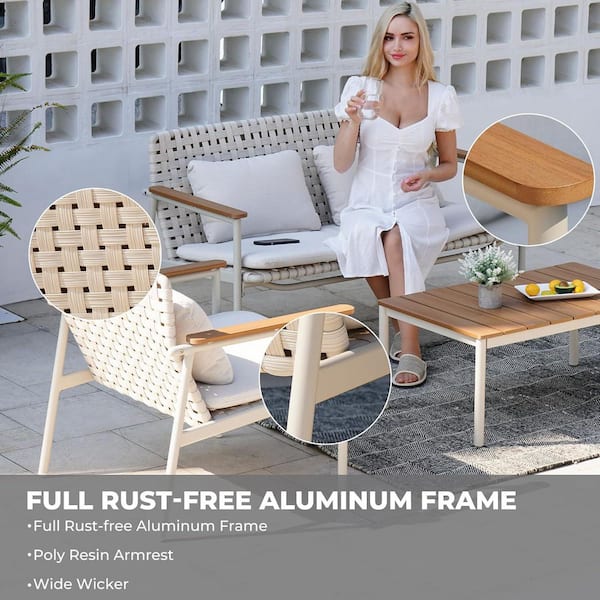 4-Piece Patio Conversation Set with Cushions Extra Wide Wicker Loveseat Sofa Arm Chairs and Fake Wood Grain Coffee Table