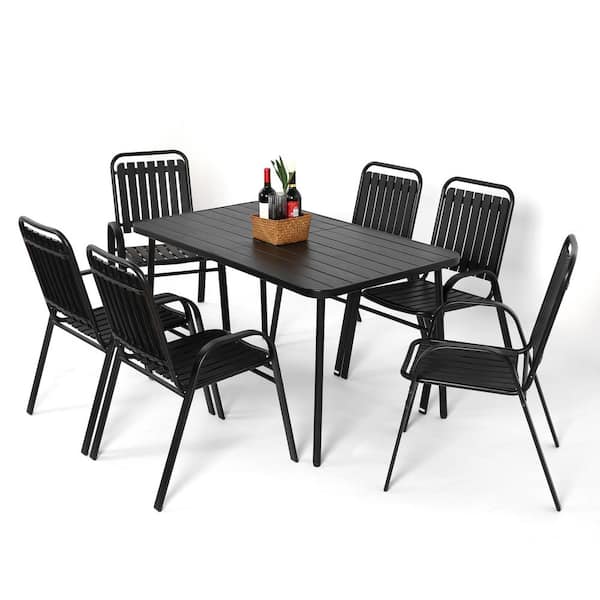 Black 7-Piece Outdoor Dining Set All Metal Table and 6 Metal Frame Chairs with Plastic Seat and Back Patio Furniture Set
