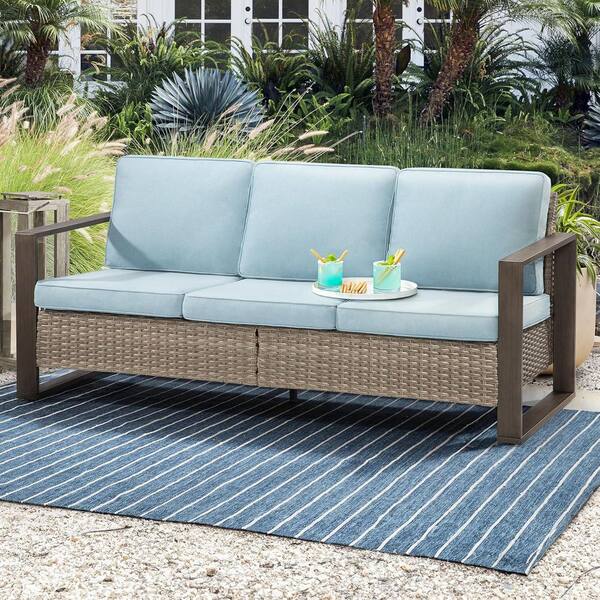 Wicker Outdoor Sectional Couch Sofa, Patio 3-Seater with Sky Blue Olefin Cushions, Metal Frame with Wood-Like Grain Arms
