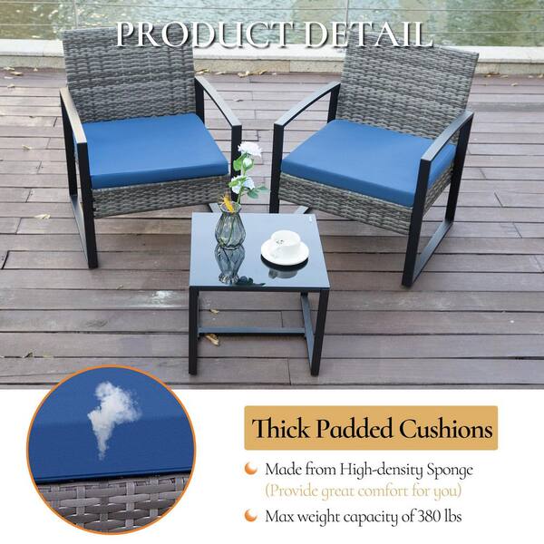 3-Piece Rattan Wicker Patio Conversation Set Outdoor Table and Chairs with Blue Cushions