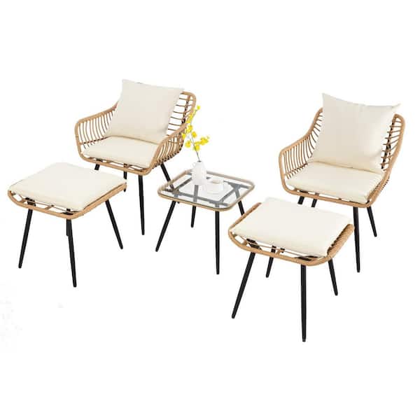 Beige 5-Piece Wicker Outdoor Bistro Set with Washed Beige Cushion