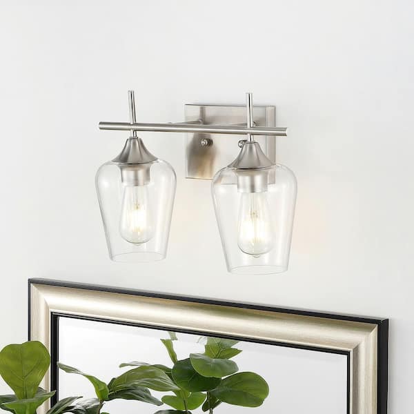 13.9 in. 2-Light Brushed Nickel Bathroom Vanity Light with Clear Glass Shades