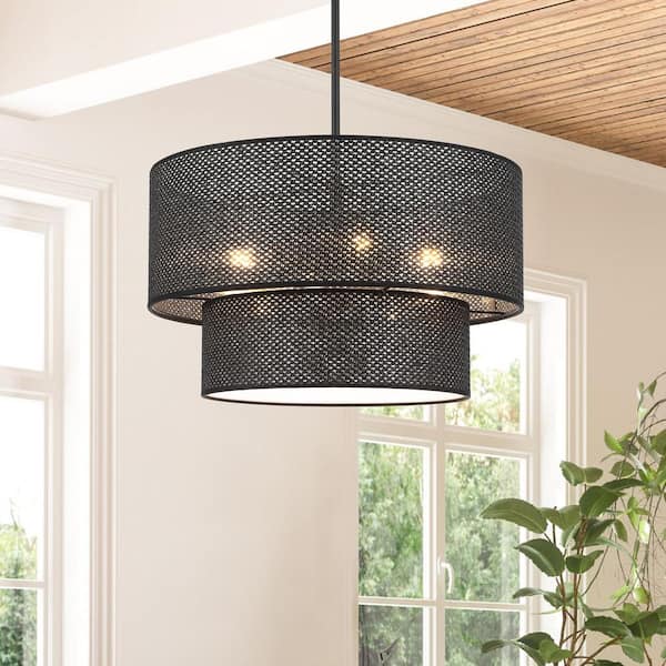 20 in. 4-Light Black Drum Shaded Chandelier with 2-tier Fabric Shade