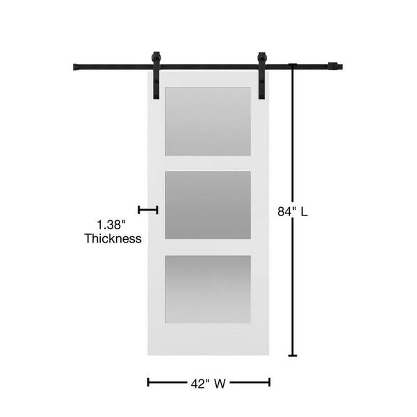 42 in. x 84 in. Shaker 3-Lite Frosted Glass Primed MDF Sliding Barn Door with Bent Strap Hardware Kit