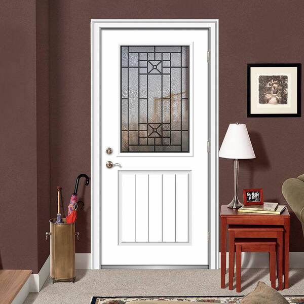 32 in. x 80 in. Courtyard Left-Hand 1/2-Lite Decorative Planked Painted Fiberglass Prehung Front Door, 6-9/16 in. Frame