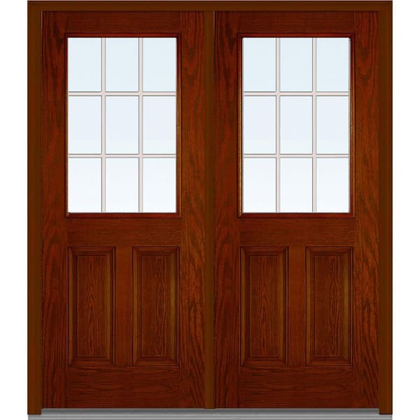 64 in. x 80 in. Tan Internal Grilles Left-Hand Inswing 1/2-Lite Clear 2-Panel Stained Fiberglass Oak Prehung Front Door
