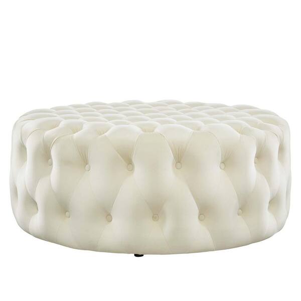 Amour Tufted Button Large Round Performance Ivory Velvet Ottoman