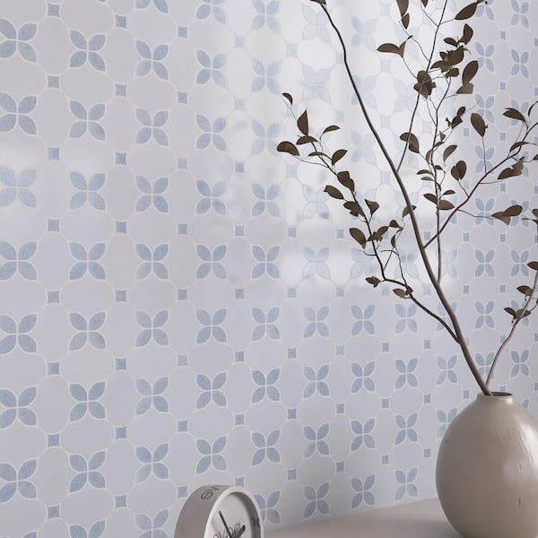 Clover Bloom White and Blue 11.82 in. x 11.82 Floral Polished Marble Mosaic Tile Sample