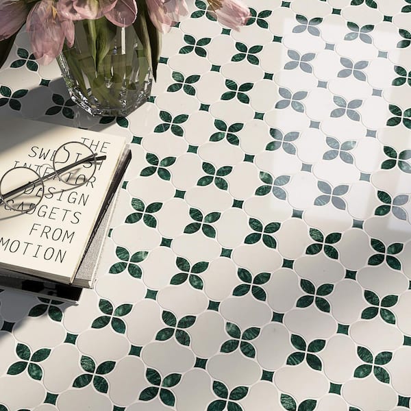 Clover Bloom White and Green 11.82 in. x 11.82 Floral Polished Marble Mosaic Tile Sample