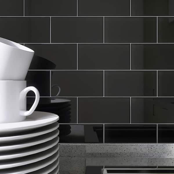 Crystile Black 6 in. x 3 in. Subway Glossy Glass Mosaic Tile Sample