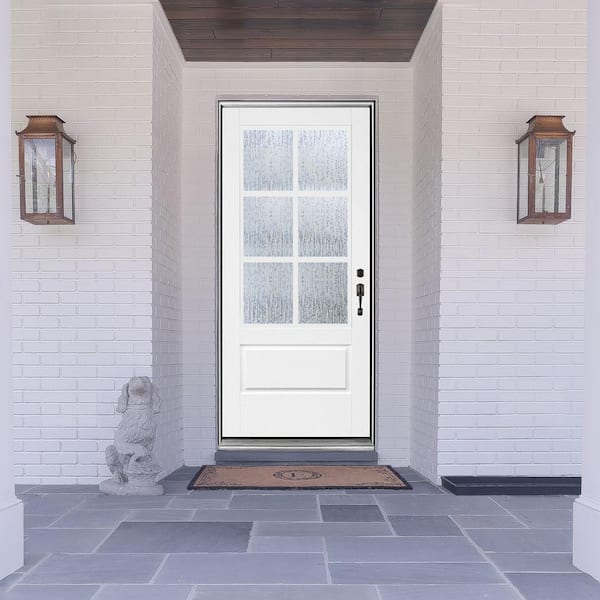 36 in. x 80 in. 3/4 Lite Left-Hand Inswing 6 Lite SDL Water Wave Glass Finished White Fiberglass Prehung Front Door
