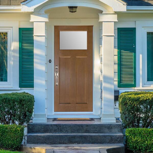 36 in. x 80 in. Right-Hand Inswing Medium Oak Craftsman Frosted Glass Fiberglass Prehung Front Door