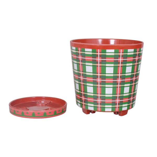 8.75 in. Dia Red and Green Tartan Pattern Melamine Pot with In-Line Saucer (2-Pack)