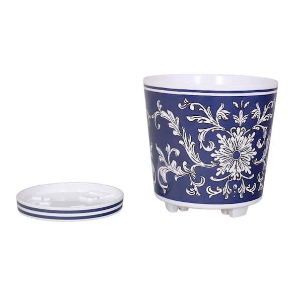8.75 in. L x 8.75 in. W x 9 in. H Navy and White Chinoiserie Pattern Melamine Pot with In-Line Saucer