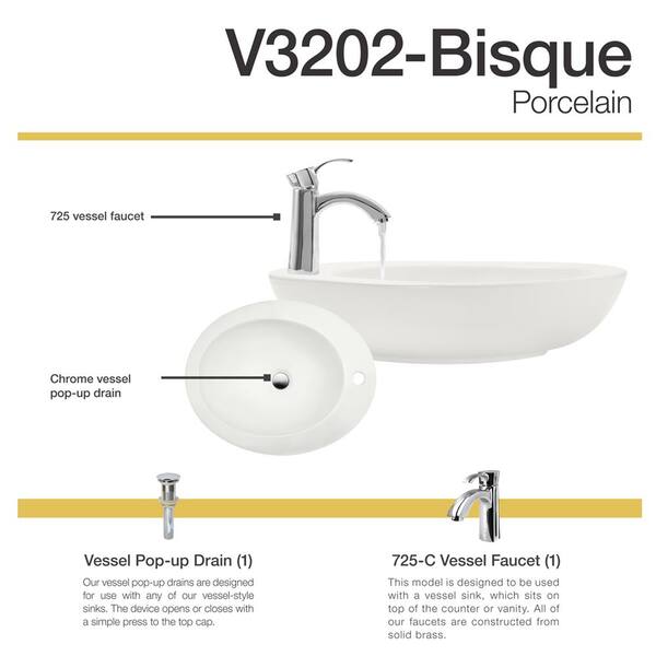 Porcelain Vessel Sink in Bisque with 725 Faucet and Pop-Up Drain in Chrome