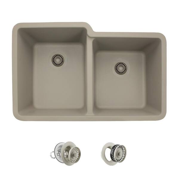 Slate Quartz Granite 33 in. Double Bowl Undermount Kitchen Sink with Matching Strainer and Flange