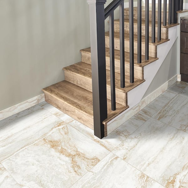 • Features a polished white stone look with a rectified edge