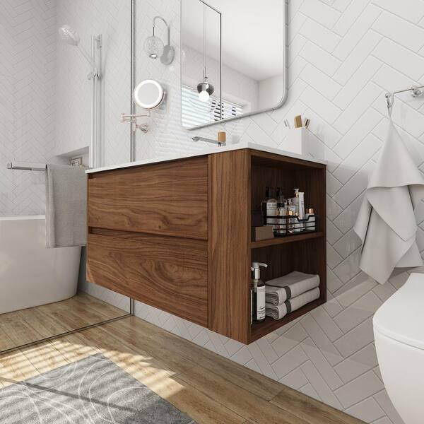 35.60 in.W x 18.10 in.D x 19.40 in.H Floating Bath Vanity in Brown Oak with Single White Gel Sink Top