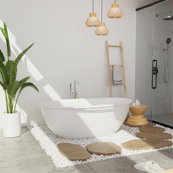 63 in. x 33.5 in. Elegant Soaking Freestanding Solid Surface Resin Stone Oval Bathtub with Center Drain in Matte White