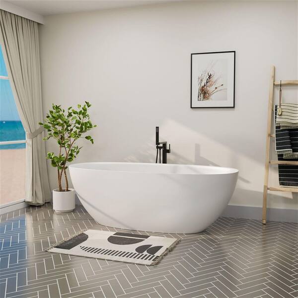 65 in. x 29.52 in. Elegant Soaking Freestanding Solid Surface Resin Stone Oval Bathtub with Center Drain in Matte White