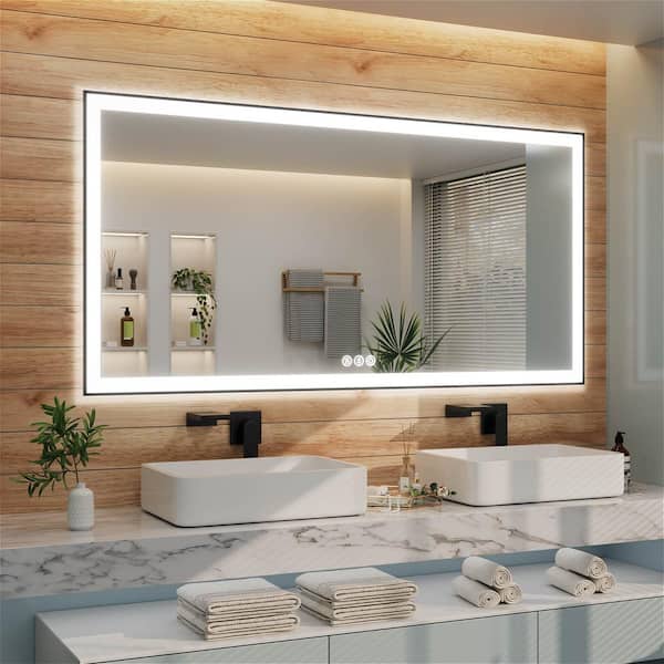 72 in. W x 36 in. H Rectangular Framed LED Light with 3-Color and Anti-Fog Wall Mount Bathroom Vanity Mirror in Black