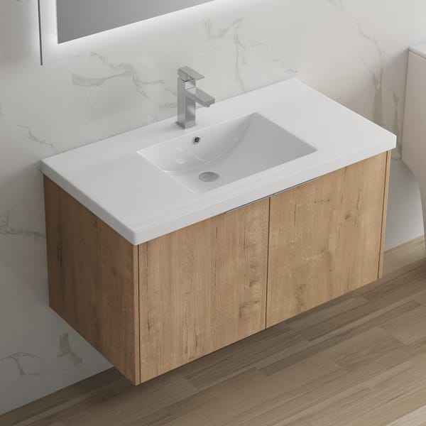 SCHAT 18 in. W x 35 in. D x 19 in. H Wall mount Bath Vanity in Imitative Oak with Strong handle and White Ceramic Top