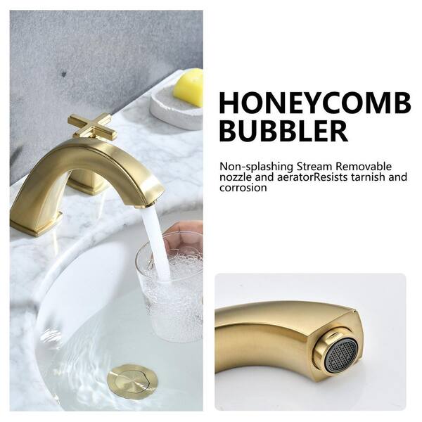 SWUP 8 in. Widespread Double Cross Handle Bathroom Faucet Combo Kit with Drain Included and Pop Up Drain in Brushed Gold