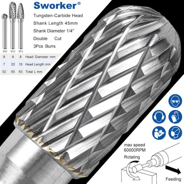 1/4 in. Tungsten Carbide Rotary Bit, Double-Cut Carbide Burr Set (3-Piece)