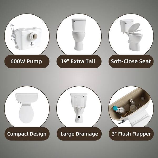 Macerating Toilet 600W White 2-Piece with 19 in. ADA Height for Basement Spaces, 1.6 GPF Single Flush, Round Bowl