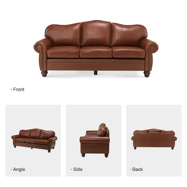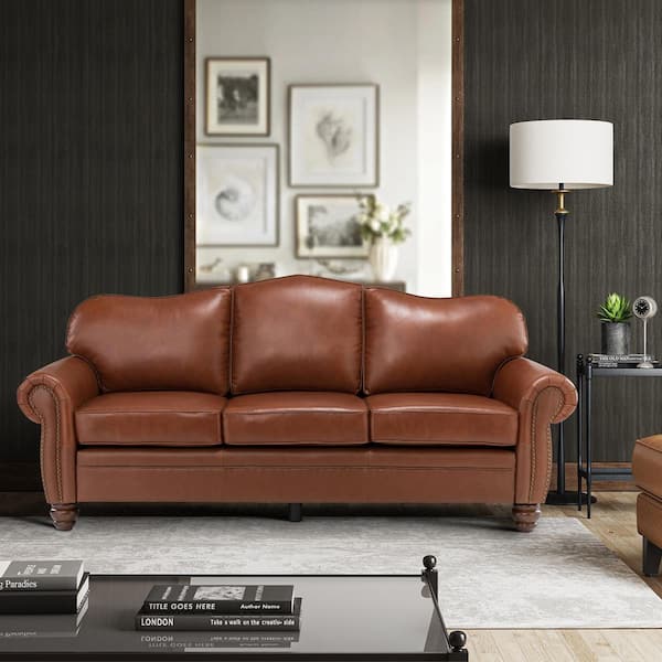 Macimo 81 in. Rolled Arm Genuine Leather Rectangle Transitional 3-Seater Sofa in Brown