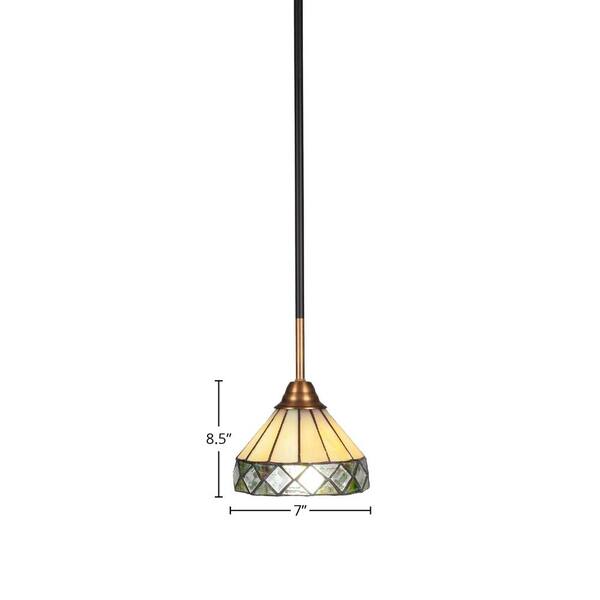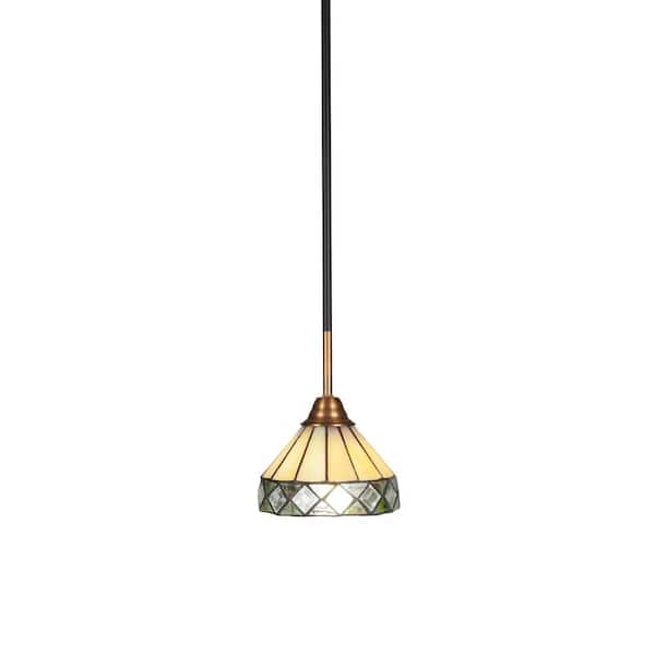 Madison 100-Watt 1-Light Matte Black Brass Shaded Pendant Light 7 in. Diamond Peak Art Glass Shade No Bulb Included