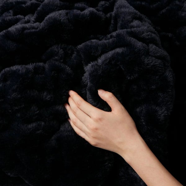 Ruched Fur Black Polyester Throw Blanket