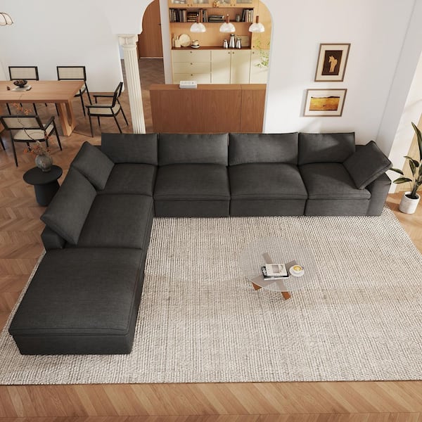 118 in. Modular Black Linen Rubber Wood Queen Size 5-Seat Sleeper Cloud Sofa Bed with Ottoman, Detachable Covers