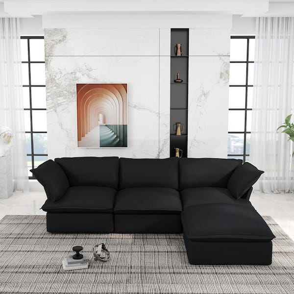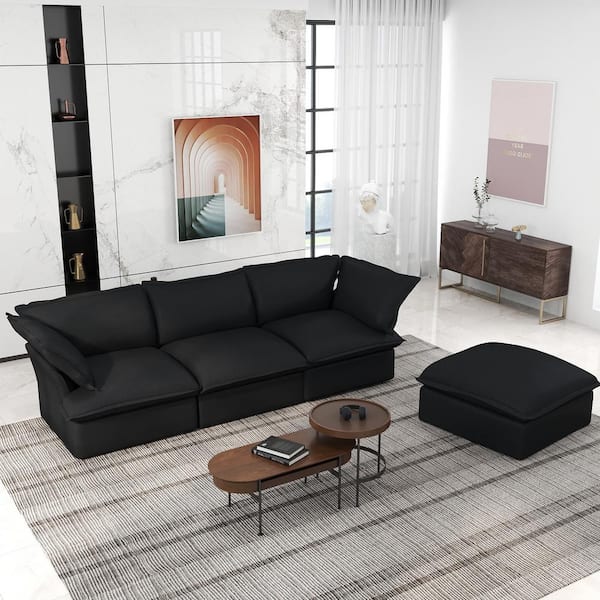 122.8 in. Flared Arm 4-Piece Linen L-Shaped Deep Seat Cloud Couch Pine Wood Sectional Sofa in Black with Storage Ottoman