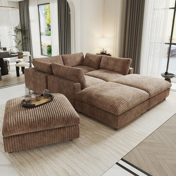 157 in. Square Arm Soft Velvet L-Shaped Modular Sofa Lawson Cloud Couch with Ottoman, Washable Covers for Party in Brown
