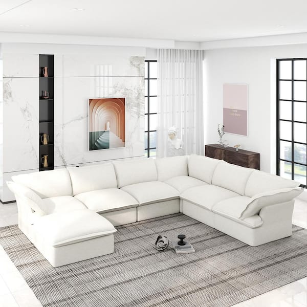 163 in. Flared Arm 7-Piece Linen Overstuffed Cloud Couch Pine Wood L-Shaped Sectional Sofa in White with Storage Ottoman