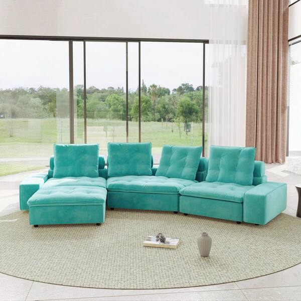 176.4 in. Square arm Rectangle 3-Seater Frosted Velvet Free Combination Modular Sectional Sofa with Ottoman in Aqua blue