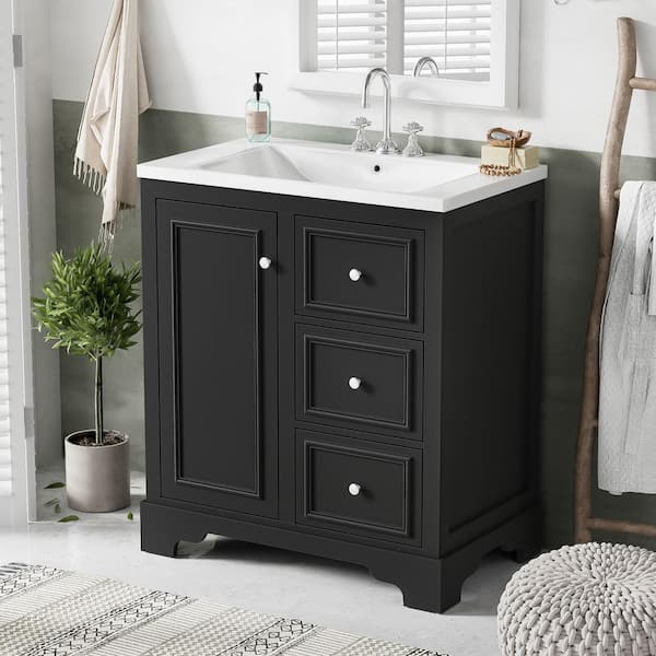 30 in. Retro Single Sink Freestanding Storage Bath Vanity in Black with White Ceramic Top,Drawers and Adjustable Shelves