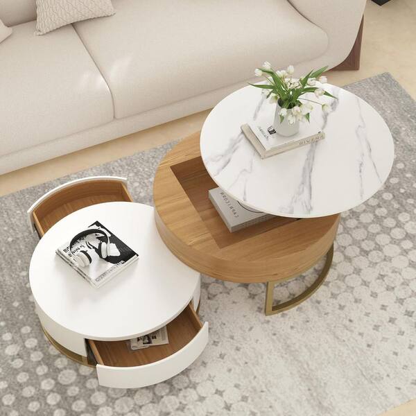 31 in. White and Brown Round Sintered Stone Top Nesting Coffee Table with Lift Top, 2 Storage Drawers for Living Room