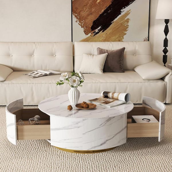 33 in. White Round Storage Sintered Stone Drum Coffee Table Center Table with 2 Drawers for Apartment, Fully Assembled