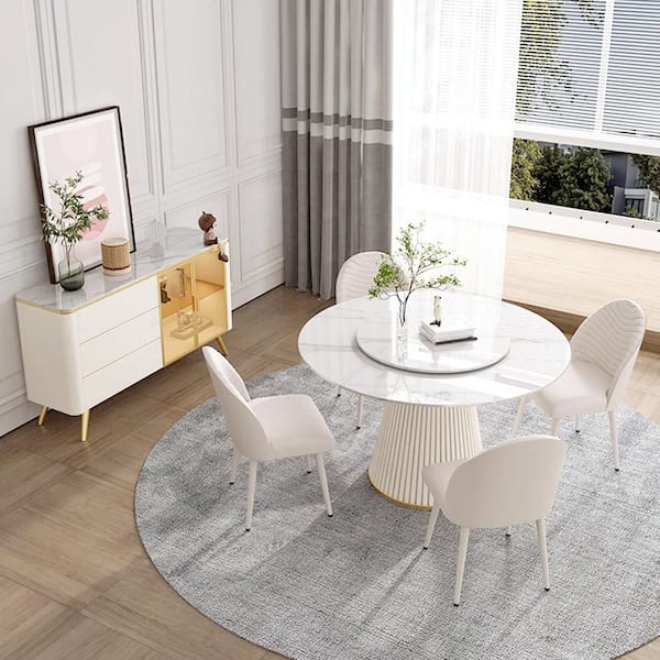 53.15 in. White Circular Rotable Sintered Stone Tabletop with Lazy Susan Pedestal Base Kitchen Dining Table (Seats-6)
