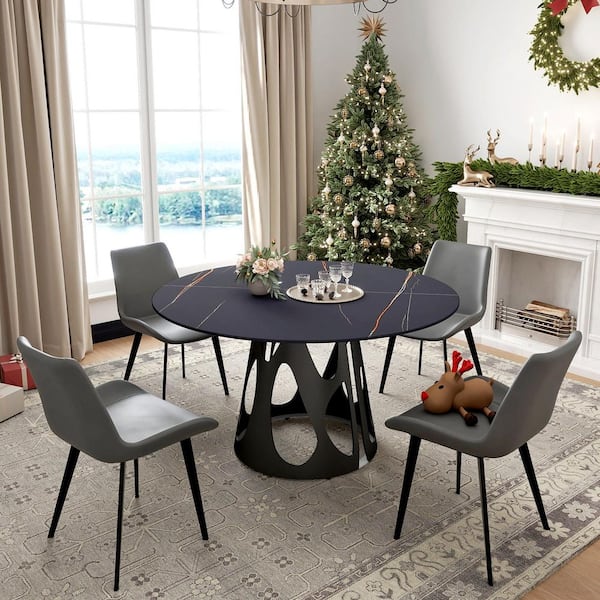 53 in. Black Round Sintered Stone Tabletop with Black Metal Pedestal Base Dining Table (Seats 6)