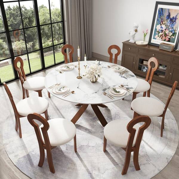 59.05 in. Ink Round Sintered Stone Tabletop with Dark Walnut Carbon Steel Legs Pedestal Base Dining Table(Seats-8)